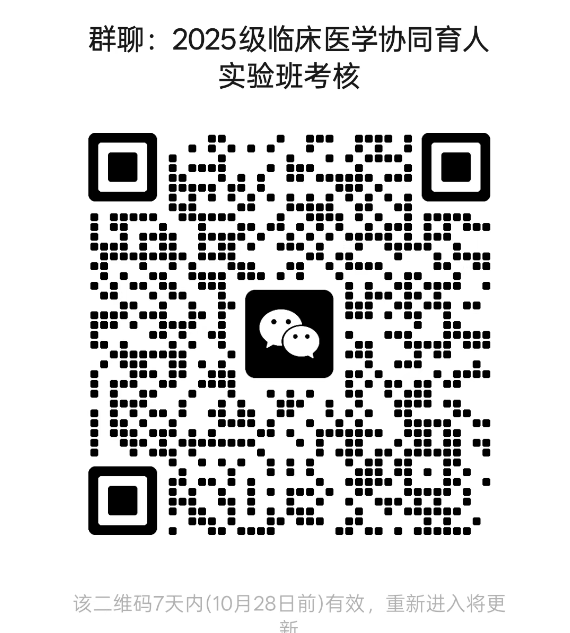 根据《关于选拔2025级临床医学跨学科协同育人实验班学生的通知》安排,学院对报名2025级临床医学跨学科协同育人实验班选拔的学生进行资格审查、汇总,有132名学生符合报名条件,进入选拔考核,现将学生名单进行公布。请符合条件的学生扫描下面二维码加入2025级临床医学协同育人实验班考核群。