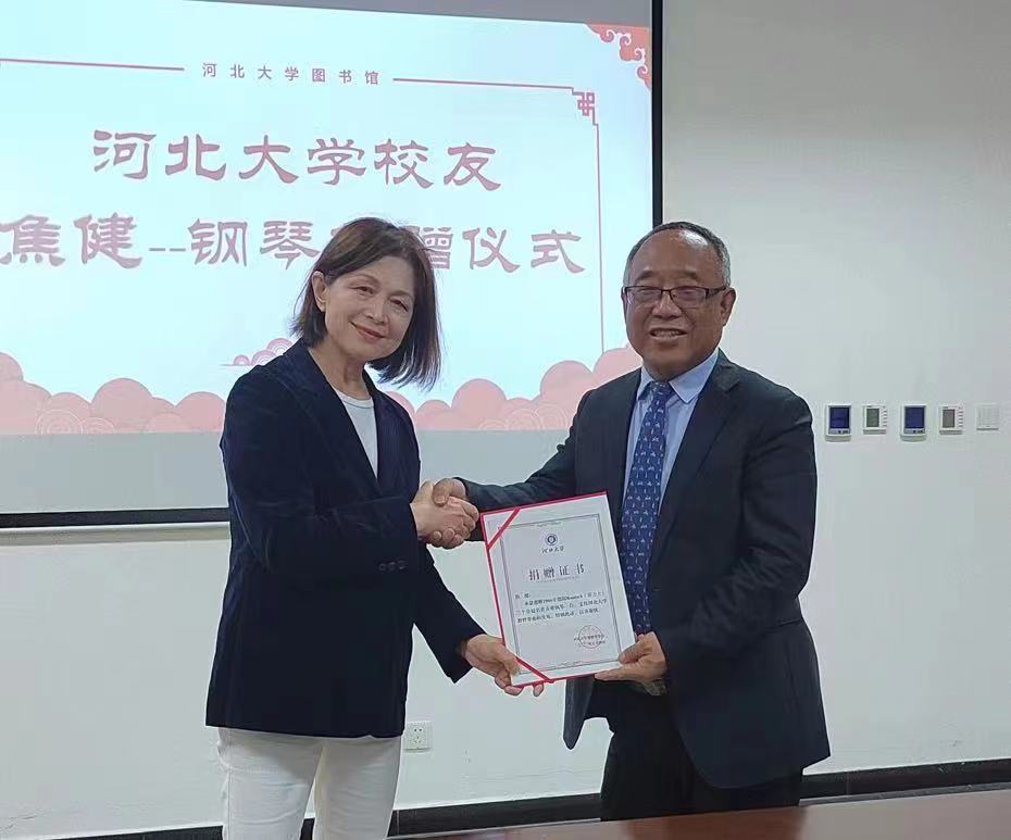 校友焦健向母校捐赠百年钢琴校友焦健向母校捐赠的百年钢琴于七一路校区图书馆“坤舆阁”内展放,以发挥其文化传承的作用,结合书香熏陶河北大学学子。