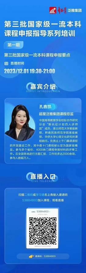 直播入口:参训教师可扫描二维码或学习通右上角输入邀请码53884803加入课程,观看直播。