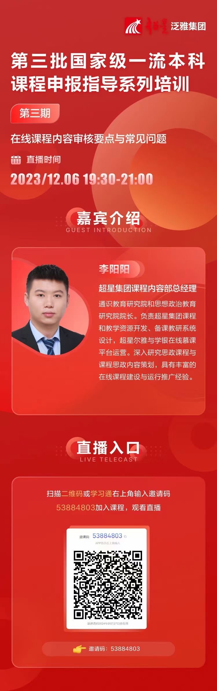 直播入口:参训教师可扫描二维码或学习通右上角输入邀请码53884803加入课程,观看直播。