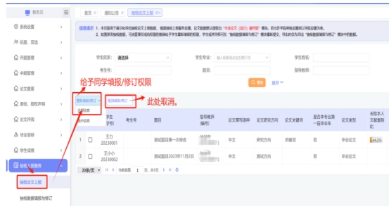 1.教学秘书进毕业论文管理系统,进入“抽检上报服务”,给与“重新填报或修订”的权限。见下图: