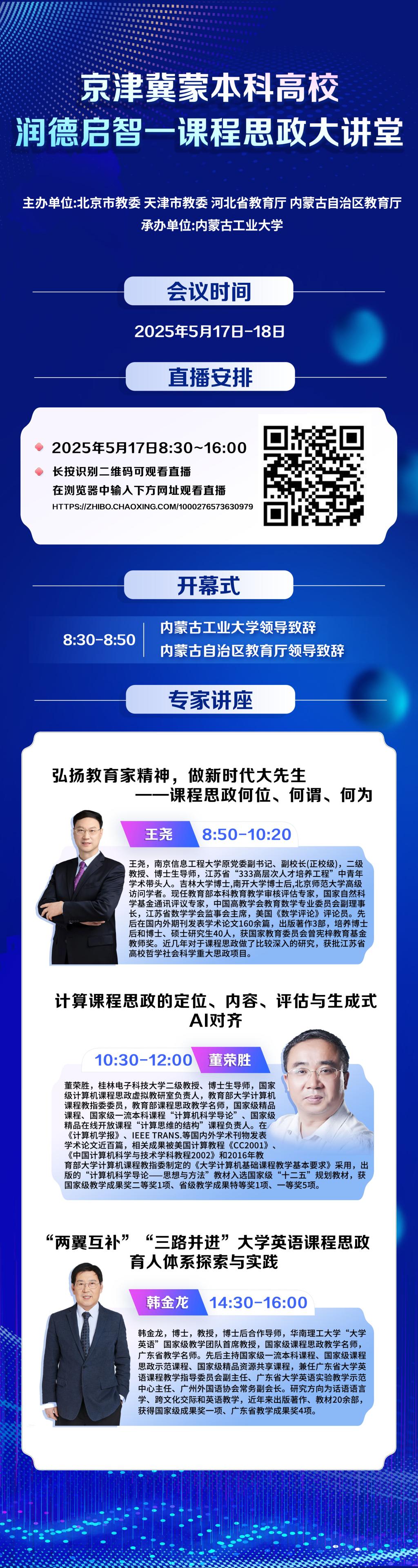为推进高校课程思政建设,帮助高校教师熟练掌握课程思政育人的方法和策略,提高课程思政育人的质量和效果,北京市教育委员会、天津市教育委员会、河北省教育厅、内蒙古教育厅联合举办京津冀蒙本科高校“润德启智-课程思政大讲堂”活动。学校拟组织大学英语、大学计算机、大学数学公共课教师在线收看第一期专题讲座直播,同时鼓励其他课程教师积极观看。具体安排如下: