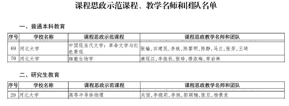 5月10日,教育部高等教育司发布了《关于课程思政示范项目名单的公示》,我校《中国现当代文学:革命文学与红色景观》《细胞生物学》2门课程入选普通本科教育课程思政示范课程、教学名师和团队,《高等半导体物理》课程入选研究生教育课程思政示范课程、教学名师和团队。具体名单如下: