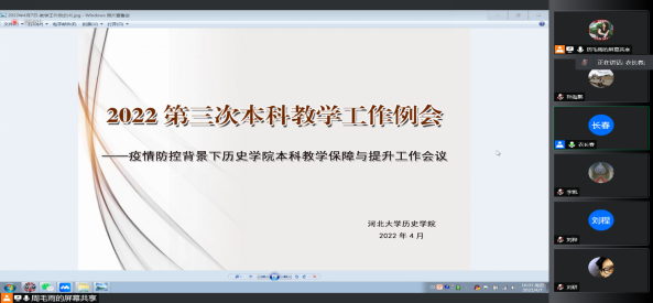 历史学院按照学校疫情防控的总体要求,遵循师生健康为第一,不降低标准,灵活实施的原则,有序开展本科线上教学活动。为全面摸清闭环管理以来学院教学状况和学生学习状态,历史学院用一周的时间全面调研学院本科教学工作状态,重点部署本学期教学的重点、难点工作,充分调动和发挥教研室的积极作用,利用线上互听互评等小型教学研讨、教学观摩活动,全面探索教研活动的有效方式和方法,助力教学水平提升,为疫情防控背景下的本科教学保驾护航。2022年4月7日下午,历史学院在前期调研基础上组织召开了2022年第三次教学工作例会,围绕“疫情防控背景下历史学院本科教学保障与提升”通报调研结果,展开研讨,规划下一步的工作方向。院长肖红松、教学副院长衣长春、系室主任、院级督导、教学秘书共计11人参加了此次会议。