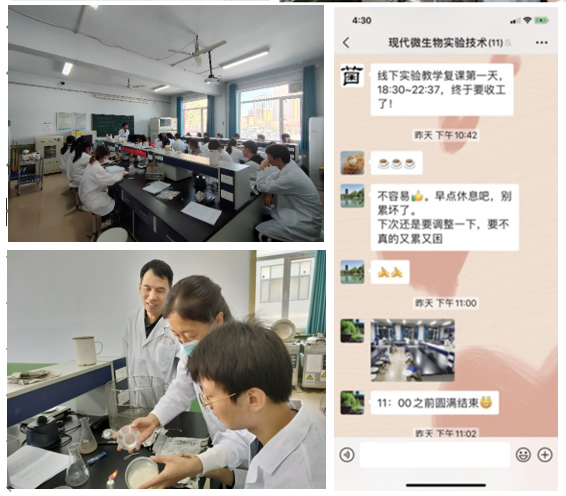三位老师入校后便投入到了紧张的教学准备工作。他们详细研讨课堂教学细节,准备实验器材和物品,为线下复课做着充分准备。第一堂课是两个平行班、共60多名学生同时进行实验。由于线下课程耽误近一个月,为了保证“同时等效”,如期完成教学任务,两个实验模块同时进行,工作量比平时翻倍。老师们不停地穿梭在学生中间,紧盯学生实验过程,对学生的操作及时给予点评和指导,这堂实验课从晚上18:30持续到了近23:00。