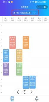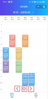 点击页面顶部下拉箭头可选择周数,查看其他周次课程信息。点击页面下方左右箭头可查看上一周或下一周课程安排,点击下方中间图标回到本周课程信息。