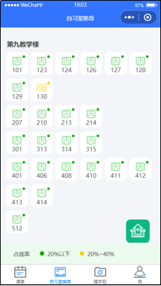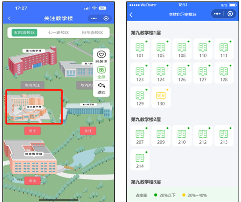 (2)关注教学楼后,点击返回,即可看到自己关注教学楼的自习室推荐情况(占座率20%以下为绿色,20%~40%为黄色)。下次访问小程序,系统会直接显示已关注的所有教学楼教室推荐情况。