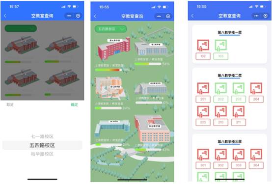 点击教学楼可显示分楼层教室详情,可查看正在使用的教室(红色图标)和空教室(绿色图标)情况。