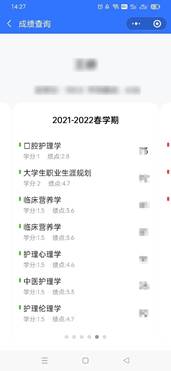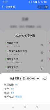 点击选择某门课程,可查看课程名、课程号、课程成绩、学分、绩点、教师姓名等信息。