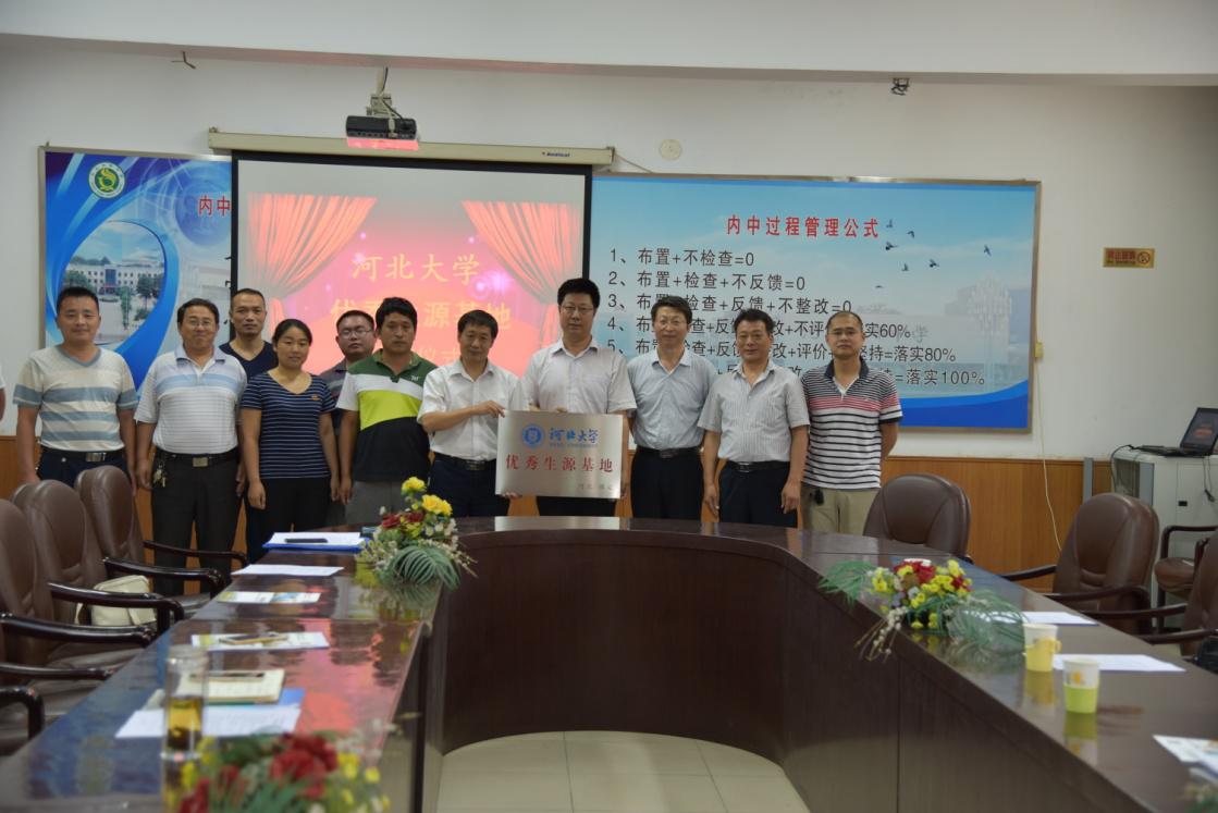 为进一步加强优秀生源基地建设,加强我校与各市重点中学的交流和沟通,提升学校影响力,吸引更多优质生源,6月24日,经济学院副院长尹成远,党委副书记张万兴等走访了内丘中学、新乐第一中学,并向这两所中学授予河北大学“优秀生源基地”牌匾。调研走访中,两所中学对我校一行的到来表示热烈欢迎,副院长尹成远、党委副书记张万兴介绍了河北大学的历史沿革、办学特色、教学科研实力、学科优势、招生规模及政策,毕业生去向、学校发展前景等。同时,内丘中学校长李文海、副校长武运虎等、新乐第一中校长强军红、副校长刘冰占等分别介绍了这两所中学的招生、教学、高考等方面的基本情况。