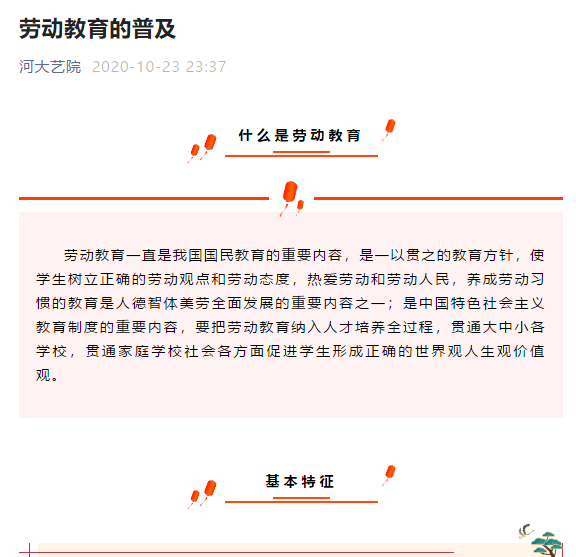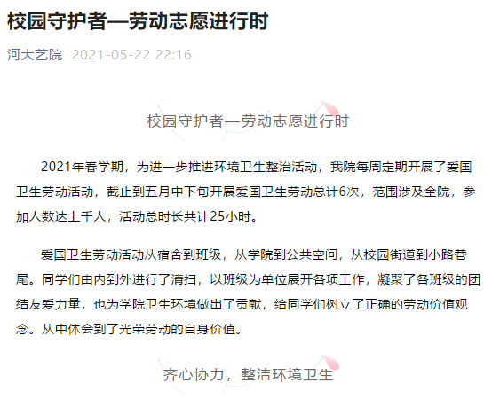 2020年以来,艺术学院利用微信公众号共发布以劳动教育为主题的推文近20余篇,通过宣传进一步加强劳动教育的成果展示,提升和深化劳动教育效果,深化劳动内涵,教育引导学生们学会劳动、学会勤俭、学会感恩、学会助人,立志成长为德智体美劳全面发展的社会主义建设者和接班人。