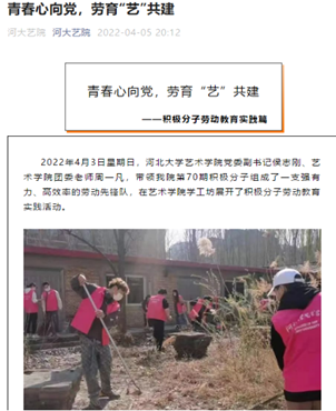 劳动教育是新时期党对教育的新要求,是中国特色社会主义教育制度的重要内容。河北大学艺术学院秉承“劳动最光荣、劳动最崇高、劳动最伟大、劳动最美丽”的工作理念,统筹指导,引导学生旗帜鲜明地反对一切不劳而获、贪图享乐、崇尚暴富的错误思想,坚持劳动教育与德育紧密结合,坚持党员和团员带动引领的劳动教育实践模式,通过以劳树德、以劳增智、以劳强体、以劳育美四种形式,教育引导学生崇尚劳动,明确弘扬劳动精神、重视劳动教育对自身成长的重要意义,建立崇尚劳动的价值共识和行动自觉。
