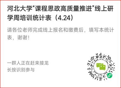 请参训教师扫描二维码进行报名和缴费。报名成功后,扫描小程序接龙填报《河北大学“课程思政高质量推进”线上研学周培训统计表》。