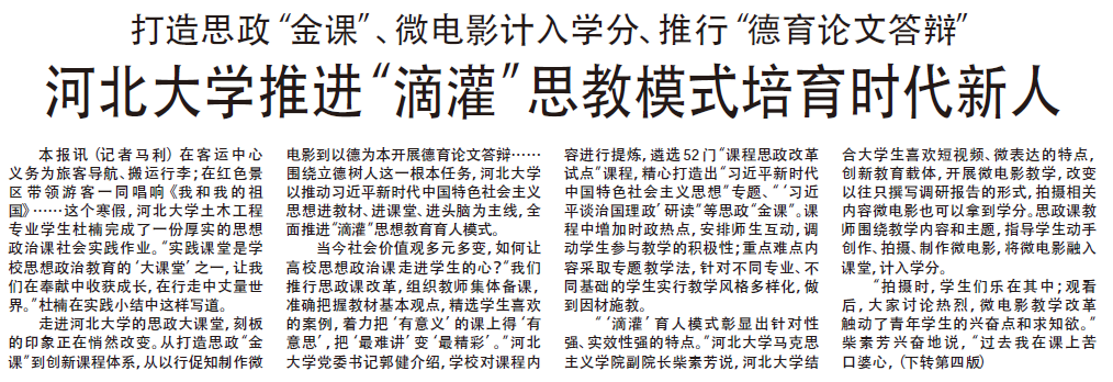 走进河北大学的思政大课堂,刻板的印象正在悄然改变。从打造思政“金课”到创新课程体系,从以行促知制作微电影到以德为本开展德育论文答辩……围绕立德树人这一根本任务,河北大学以推动习近平新时代中国特色社会主义思想进教材、进课堂、进头脑为主线,全面推进“滴灌”思想教育育人模式。