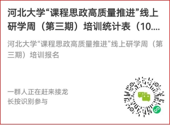 请参训教师扫描二维码进行报名。报名成功后,扫描小程序接龙填报《河北大学“课程思政高质量推进”线上研学周(第三期)培训统计表》。