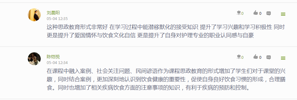 学生普遍认为通过在课程中融入思政教育,在一定程度上提高了学习兴趣和学习的主动性、积极性,更坚定了正确的人生观、价值观,提高了自己的爱国情怀和饮食文化自信,提升了社会责任感及职业自豪感,临床批判性思维能力和综合分析问题的能力得到进一步提升。