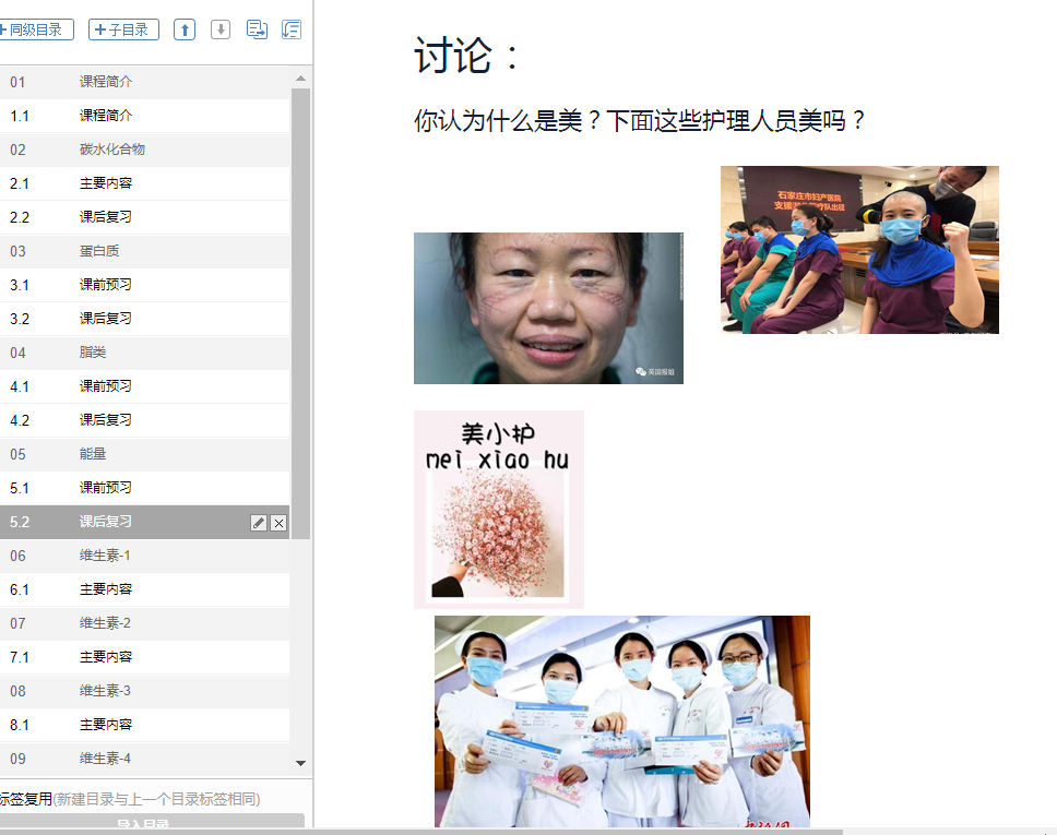 4.“营养评价”内容中,融入人际沟通和护患沟通的技巧,帮助学生建立和谐的人际和护患关系;并引入“美”的探讨,让学生体会抗疫一线的医护人员是最美的人。