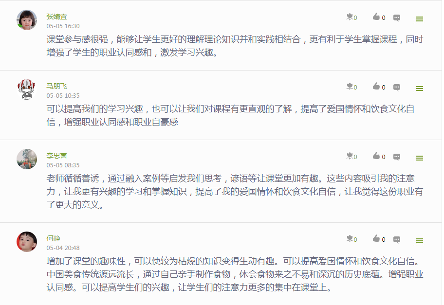 增强学生的饮食文化的自信,爱国主义情怀和民族自豪感,创新能力和辩证思维能力得到提高 |