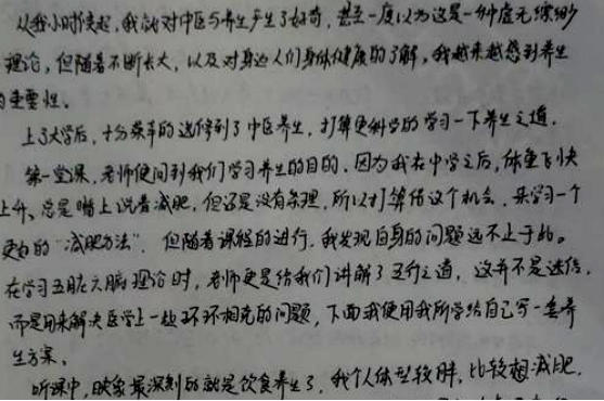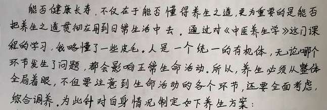 有的同学利用养生知识,为自己制定一套养生方案。希望他能坚持力行。有的同学为父母甚至祖父母制定养生方案,有利于提高家庭和谐的氛围和健康水平。有的同学意识到道德健康是有利于身体健康的,从而有助于提高自己的三观水平。