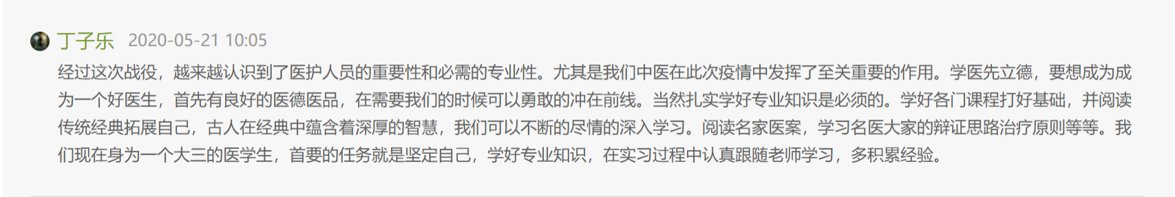 通过回顾中医学光辉的抗疫历程,使学生了解任何瘟疫都是可防可治的。新冠疫情期间,在党和政府领导下,全国人民众志成城,共克时艰,激发学生攻克疫情的信心,为抗疫斗争贡献力量。假期内不少学生参与到社区抗疫志愿服务中,用自己的专业知识服务群众,并且在服务中寻找创新点。