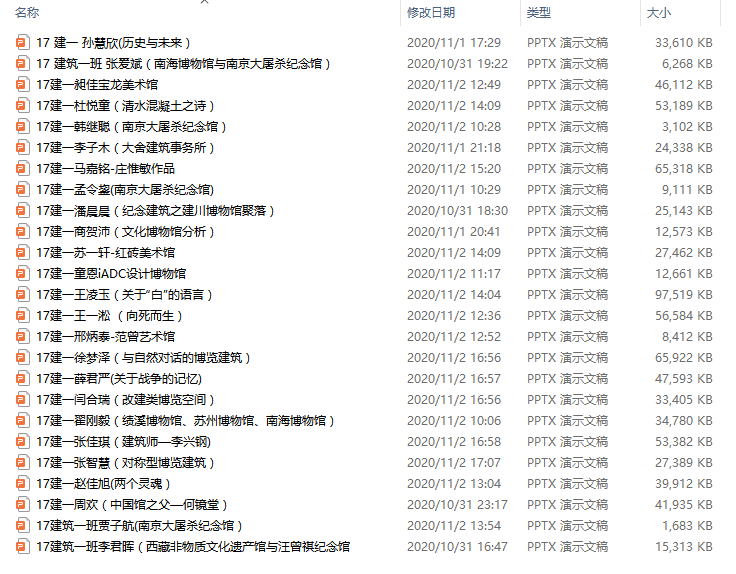 另外,本次期中作业,学生除需完成纪念博展类建筑的收集整理工作,还从中选出了部分优秀作业,在学期第十四周课上安排了作业发表环节。而2018级建筑学专业核心课程《建筑设计3》,当时正值第二个课程设计环节——博物馆建筑课程设计,以“跨年级·跨课程”融合的授课形式,让2017级建筑学此次优秀作业学生汇报公开课的形式,让2018级建筑学全体(除个别有选修课冲突学生外)到场旁听,达到了鼓励优秀学生,促进课程设计学习等多种教学目的。2017级和2018级学生评价均较好(上图为部分学生作业文件列表)。