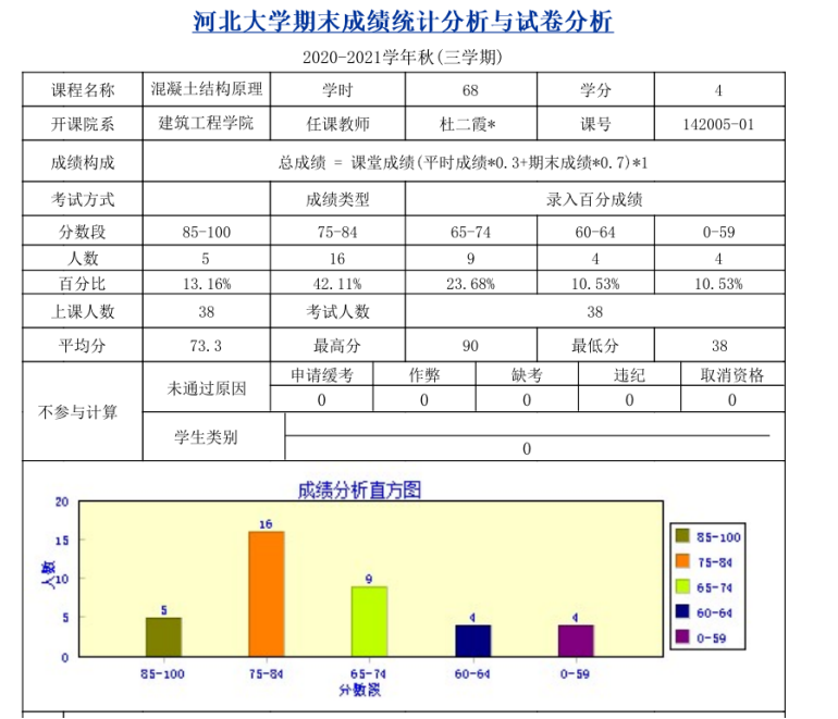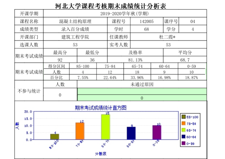 一个学期的课程实施结束,回顾一下,确实有不少收获。通过课程思政润物无声的融入,学生的学习态度和学习的主动性得到了加强,学习成绩也有明显的提高。下图是两届学生的期末成绩统计情况,不管是平均成绩还是成绩分布都有明显提升。当然,课程思政还有很多需要完善的地方,比如,可以增加教学案例,或者深入挖掘混凝土的设计方法与人才素质培养的关系,把课程打造成工科示范课程,并在其他专业和兄弟院校进行推广。