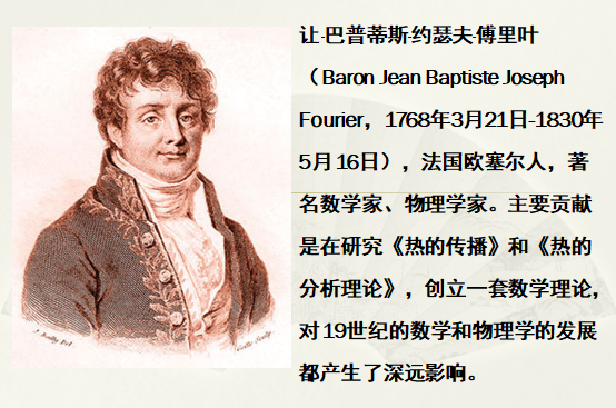思政要素:引入傅里叶生平的简单介绍。傅里叶在1807年研究热传导问题的时候就提出了傅里叶变换,但论文遭到拉格朗日的反对而未发表;1810年在对研究进行了不断的补充、完善的基础上仍未被发表。但他并为因此放弃研究,1822年他终于将论文的数学部分扩充成为一本书《热的解析理论》进行出版,成为数学史乃至科学史上公认的一部划时代的经典性著作。傅里叶的这种踏实严谨、耐心专注、吃苦耐劳的品质对学生敬业精神的培养起着示范作用。