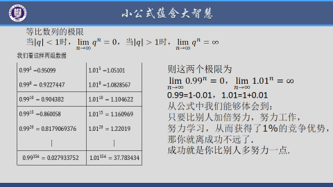 增强民族自豪感和文化自信。 通过等比数列极限这一公式,说明成功就是你比别人多努力一点. 通过反证法证明极限唯一性,介绍逆向思维能力。 通过类比法把极限概念推广到多元函数 |