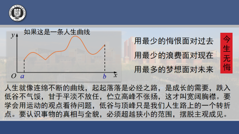 自然界中有许多现象,如气温的变化,河水的流动,植物的生长等等,都是连续地变化着的.这种现象在函数关系上的反映,就是函数的连续性。高中的目标是考上理想的大学,你们为此奋斗了三年,实现了自己的理想,大学期间,我们每个人都要进行一下自己的职业规划,也就是要树立自己的一个目标,并为此而努力,把大学期间这段连续曲线画的更完美,为我们的最终目标打下一个良好的基础。时间是连续的,同学们一定要珍惜大学期间的好时光,把握四年的大学生活,不能让任何事物、任何坏习惯成为打破完美校园生活的“间断点”; 同时,生命也是连续的,珍惜生命,不要碰到问题就走极端,生命一旦出现间断点,便不可能“补充”为连续了。希望大家经过大学四年的奋斗,实现一次飞跃,使我们有一个更高的起点,在此基础上实现更大的价值。
