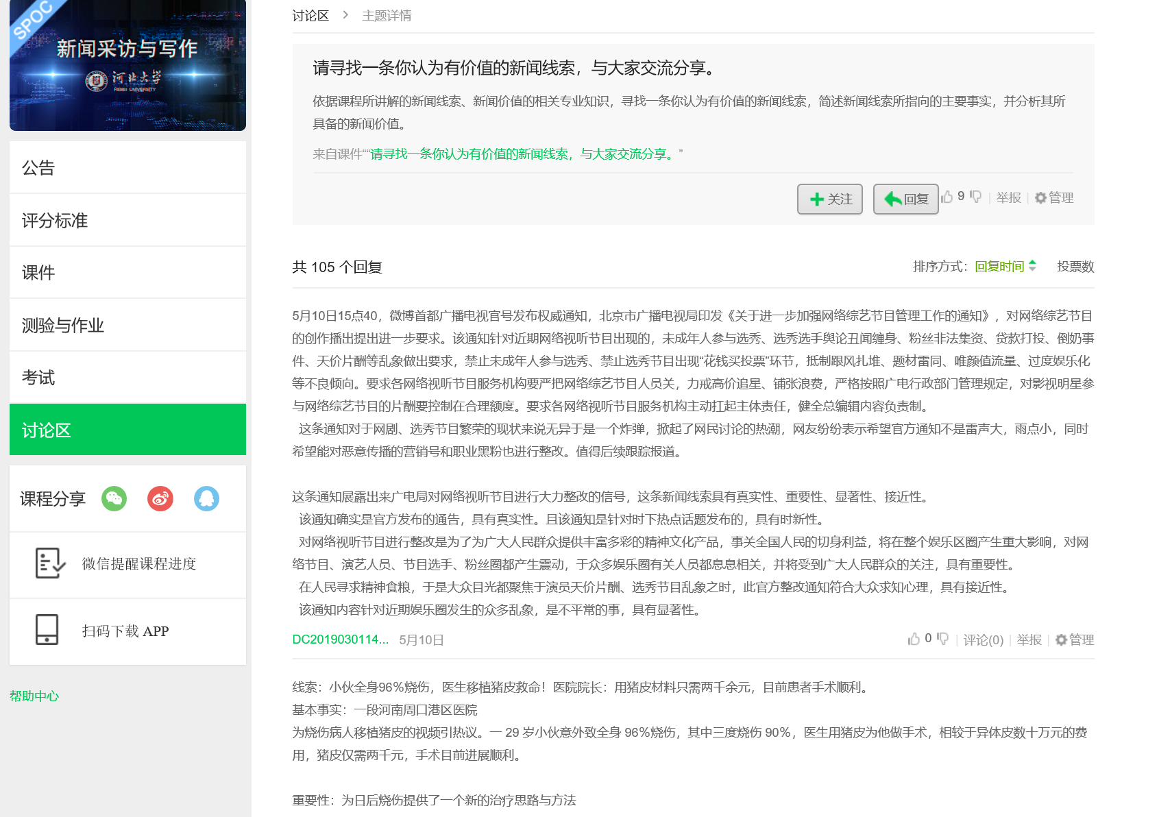 中国大学MOOC平台新闻采访写作线上课程讨论区的新闻线索讨论贴