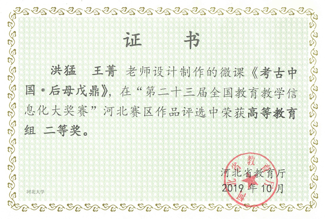 (四)教师以身示范,以高标准严要求来提升课堂质量,充分把《考古中国》这门课蕴含的文化性、科学性和实践性展示出来,进而感染学生,提升课程思政育人水平。具体操作中,比如针对考古学的实践性特点,主讲教师亲自主导设计过《中国考古学通论之新石器时代炊器》、《考古中国·后母戊鼎》等微课作品,还获得了河北省教育教学信息化二、三等奖的奖励,积极把这些内容带入课堂,变革教学模式,加强建构性学习法和情境教学的比例,带动学生科学精神和动手能力的培养,起到了很好效果。