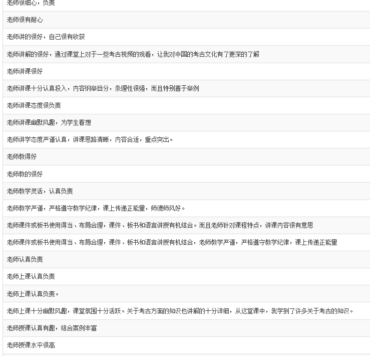 经过课程思政改革建设,《考古中国》课程思政水平明显提高,学生们能够实现知识创新,增强了文化自信,培育了科学精神,增强了实践能力,人文素养得以提升,情感价值显著提高,育人成效显著。学生对于课程也相应有了较高的评价。
