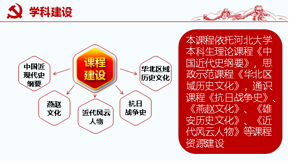 基于上述成果,本人主持的国家社科基金高校思想政治理论课专项课题《新媒体视域下高校思政课实践教学模式创新研究》获得了立项,此为本院、本校首次获批这一类别国家社科基金课题立项。与此同时,本人主持的河北省高等教育教学改革研究与实践项目《高校一流本科金课建设路径与理论创新研究——以虚拟仿真实验教学课程建设为中心》亦获批立项。上述进展均有助于将课程思政元素融会于最新的科研项目和教学创新成果之中,推动《华北区域历史文化》建设成为省级、国家级线上线下混合一流本科课程。
