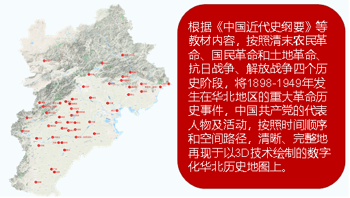 以目前正在研发、建设的《华北革命历史地图》虚拟仿真实验项目为例,其核心理念正是利用虚拟仿真技术,将近代以来华北区域内发生的重大历史事件和重要人物活动以三维仿真地图形式展现出来,让学生通过生存竞技类电子游戏的推演、行进方式,按照时间顺序进行学习。此种兼具知识性与趣味性的实验形式,使学生将人名、地名、事件、日期等繁杂枯燥、缺乏关联、难于记忆的历史知识有机地贯穿起来,收到了良好的成效。项目建成后,除用于本课程教学的实验环节外,还将用于辅助中国近现代史公共课和专业课的教学、研究,以及华北区域历史文化资源的发掘、整理、展示及成果转化等。