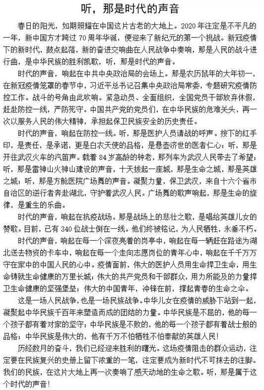 在抗疫期间,根据历史学院的号召,在观看河大青年的指尖微课团后,为了表达自己在这次防控疫情的过程中,所感受到的爱国主义的美好,扩展生命的意义,新世纪青年的担当,而写了一篇题为“千里同心,共同战“疫”的文章。