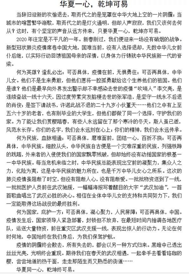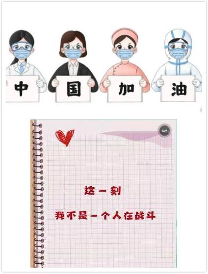 近日,新冠肺炎袭来,影响我国大部分地区。其中,湖北省及其周边地区收到的冲击尤为明显。在灾难面前,在祖国的困难时期,许许多多的人成为“逆行者”,赶赴一线。我们虽然是学生,虽然无法直接对抗疫第一线的人们提供帮助,但是我们作为华夏儿女,可以用自己的方式为武汉加油,为祖国加油!