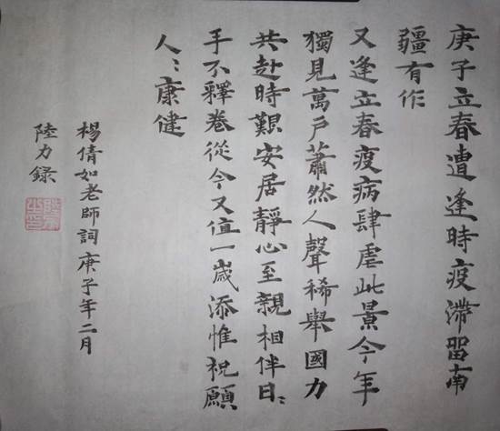 (二)词作及书法作品《庚子立春遭逢时疫滞留南疆有作》