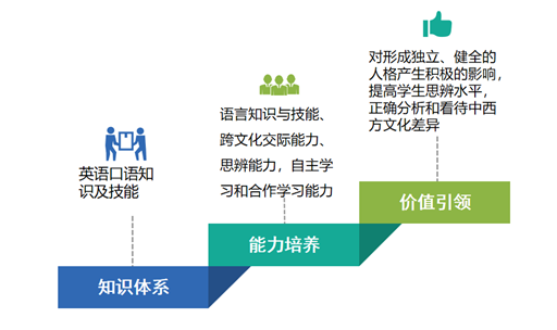 (1)本课程将英语语言文化教育与当代大学生思想道德教育紧密结合。从价值引领、知识体系和能力素养三方面培养学生英语的实际运y用能力。如下图所示: