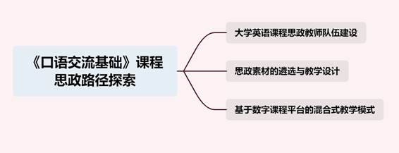 本课程负责人长期从事大学英语教学,先后主持校级、厅级、省级多项大学英语课程思政建设及教改项目,积累了较丰富的教学改革与研究经验。本课程从课程思政教师队伍建设、英语口语课程思政教学内容建设及英语口语课堂教学三个角度探索英语口语课程思政的实施路径。如下图所示: