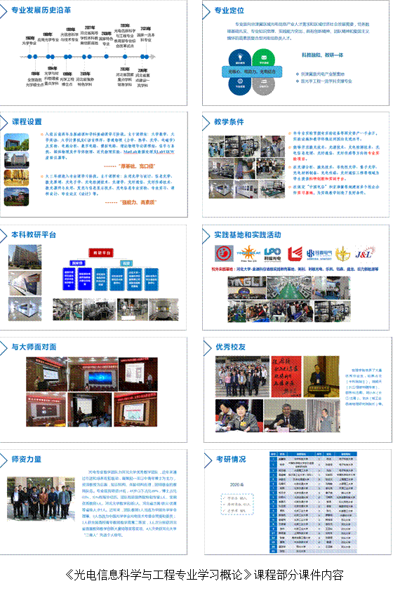 (1)介绍光电专业的历史沿革,发展现状、未来就业方向,以建立专业认同感;解读本专业的人才培养方案,明确未来大学四年的学习任务;介绍本专业的师资力量、实验条件、学科进展、就业和升学情况及优秀校友,以帮助尽快熟悉专业相关环境。