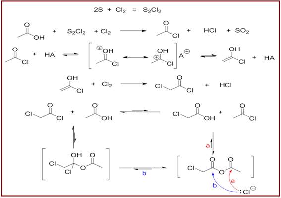 引导学生利用反应动力学知识,确定需要通过传热单元操作,将液氯变为氯气,以便提高反应速度;利用反应热力学知识,根据控温的要求,解释为什么反应需要采用在分程控制下分别通入水蒸汽、冷却水的夹套式釜式反应器;利用有机化学知识,分析从乙酸、氯气到氯乙酸的反应历程(图1)。使学生认识到崇尚科学、理论与实际结合的重要性。