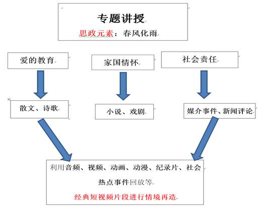 (2)实践中注重知识转化价值的能力,加强课程思政元素的注入。尤其是在知识经济背景下,学生的创新创业能力和社会价值观确立都离不开课程思政的引导与帮助。在这一过程中,学生能够掌握学习方法以及观察和思考的方法,进而形成各种能力。在这种情况下,情感、态度与价值观得以型塑。实际上,对学生除必要的思想道德教育外,还有许多心理健康、健全人格、社会责任、生活体验、情感态度等方面都需要课程思政元素加以引导和培养。而这些都可以在《基础写作》课上的散文、小说、诗歌部分的讲解中得以融入。主要的课程思政理念践行如下图所示: