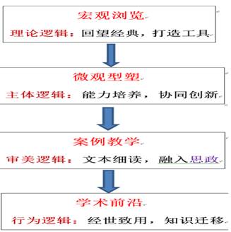 (2)在教学思路上树立严谨的逻辑创新意识。根据《基础写作》理性与感性相结合的课程性质,本课程遵循“理性逻辑——主体逻辑——审美逻辑——行为逻辑”的授课思路,总体上采取从宏观到微观的理论阐释和文本细读,同时借助案例讲解带领学生走向学术前沿。具体思路如下所示: