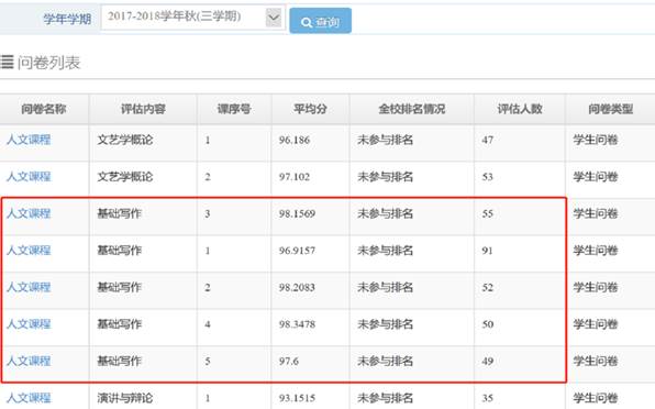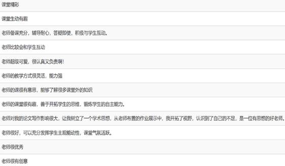 近年来,该课程在理论与实践的结合过程中,目前已经成为深受学生欢迎的一门课程。由于主讲教师不断尝试创新性尝试,理论上始终注重学生的知识迁移和转化能力的培养,实践上不断在课外建立科研团队和学术训练营等课外素质的培养,在课程考核中坚持过程性考核为主,卷面考核为辅的方式,这就使得学生有了充足的参与兴趣和展示空间。在课程评定的最后环节,每一位学生的付出和表现都会得到公允的评价和分数。60%的平时表现加40%的卷面分数相加才是该课程最终的分数。基于我们的流动管理机制和教学创新与课程思政的双管齐下,学生的综合能力和个人能力进步显著,整体效果较为理想。学生的评教成绩也较为满意,其中部分评价如下图如下: