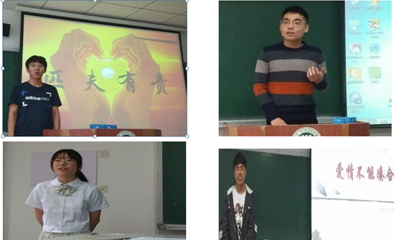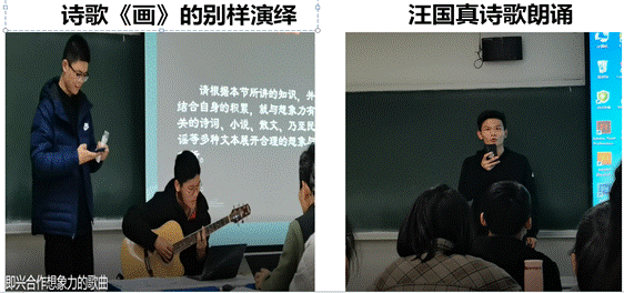 (1)才艺展示融入课堂内容。《基础写作》的课堂案例有:“以流行音乐改变学生对诗歌的态度”,“用吉他和尤克里里弹奏自认为富有想象力的作品”,“用自己喜欢的动漫电影阐释亲情与友情的叙事方式”等。通过这些生动的案例教学,学生能够积极地的参与课堂互动;教师能够以讨论、对话和探究的方式,打造对话式教学、趣味性课堂和生成性课堂。课堂侧影简略呈现如下: