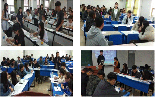 (3)在具体的课堂教学中,注重文本细读,调动学生的深度参与。尤其是在具体的知识讲授环节中,要充分发挥学生的主观能动性和参与热情,选择自己喜欢的文学经典进行文本细读。同时,借助写作学的相关理论进行文学作品的品读和赏析。在这个过程中,通过重温经典,对写作理论予以沉浸式体验;为了更好地调动课堂气氛,有表演才能的同学还可以通过才艺互动来参与翻转课堂。对于有深度学习能力和学术研究潜质的同学,还可以参与主讲者的学术训练营,进行科研能力的课外拓展。总的来说,对于《基础写作》的授课环节,主要分为“文本细读:走进原创;理论奠基:重温经典;翻转课堂:才艺互动;学术创新:多平台协同”等具体过程。在授课形式上主要采取“小组讨论:兴趣主导;任务驱动:自主学习;主题分享:各抒己见;情境再造:剧本排练”等丰富多彩的形式组织课堂。课堂侧影如下图所示: