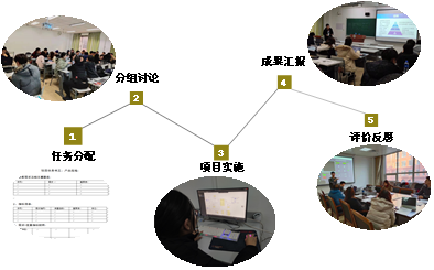 采用项目化教学方式,以学生为中心,任务为驱动,学生通过自主学习、协作讨论、行动学习和实践,完成小组任务。通过产品开发全过程的训练(如图8),锻炼学生产品开发能力和工程管理能力。具体包含任务分配、分组讨论、项目实施、成果汇报、评价反思五大环节,学生通过自主学习、协作讨论、行动学习和实践,运用项目管理理论知识完成团队任务。老师则在整个过程中发挥引导、辅助和监控的作用。