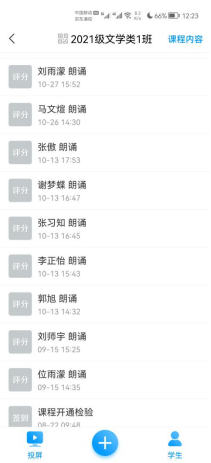 要求每一名学生朗诵表现社会主义核心价值观的现当代文学作品,时间为3-5分钟,每节课由一名学生朗诵,全班同学使用手机学习通评分。(下图为布置朗诵作业的PPT页面)