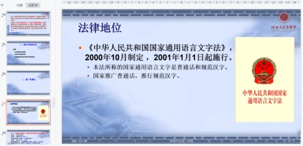 介绍汉语普通话的法律地位(《中华人民共和国国家通用语言文字法》),让同学们意识到说好普通话,写好规范汉字,是我们的义务。(下图为课堂讲解所用的PPT页面)