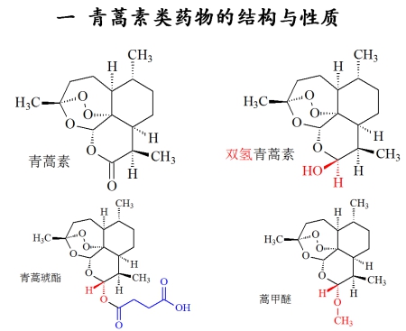 通过图片展示、讲解突出青蒿素药物的分子结构特征,关联分子结构与理化性质,回顾光谱、色谱基础知识,加强练习该类药物分析的试题。